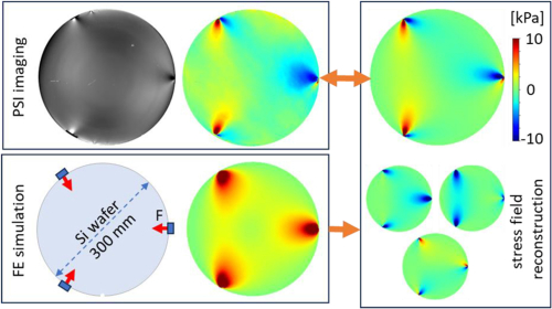 Defect inspection methods are basic steps in electronic chip manufacturing and power device production processes in the semiconductor industry. Based on stress induced photoelastic anisotropy, in-line polarized stress imaging (PSI) and quantitative determination of the local shear stress component are possible in single crystalline silicon wafers. Hereafter, such polarization stress images are compared and validated quantitatively with results of finite element simulations based on different 3D elastic models. Uniquely, high resolution at high throughputs is achieved for 300 mm wafer size in the present quantitative stress imaging study. The experts of Semilab explored the possibilities of different polarization imaging methods through studying models of a 300mm Si wafer sample.